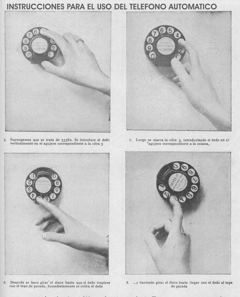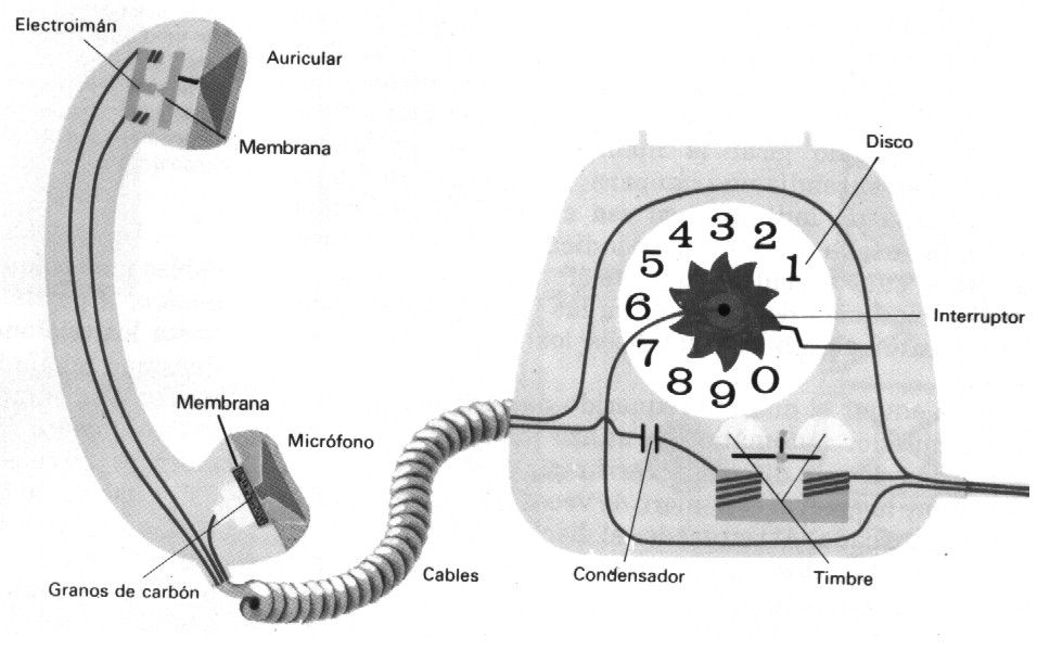 En los extremos del mango se hallan el micrófono, en el que las ondas sonoras hacen variar la resistencia eléctrica de una cápsula que contiene granos de carbón, lo cual se traduce en variaciones de corriente, y el auricular, en el que las variaciones de la corriente magnetizan en grado variable a un electroimán, lo cual es traducido por una membrana en ondas sonoras. Para marcar se hace girar el disco, que se halla solidario con una rueda dentada, sobre la cual se apoya un pequeño interruptor. Este produce tantas interrupciones del circuito eléctrico al que el teléfono esta conectado como dientes ha recorrido la rueda en su giro. Dichas interrupciones dan lugar a una secuencia codificada de impulsos que corresponden al teléfono al que se esta llamando. En la centralita se descodifica esta información y se establece conexión con el teléfono deseado, cuyo timbre empieza entonces a sonar.